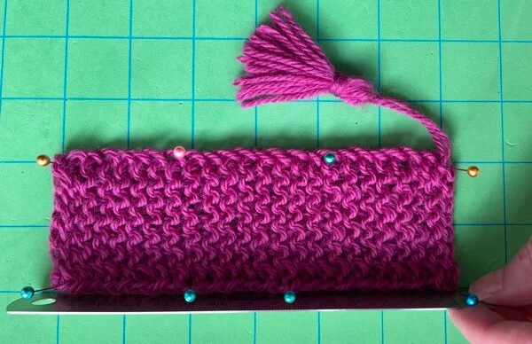 Then lay your bookmark to dry on a towel, or a piece of foam etc. Anything you can leave something damp on will do. Take a couple of minutes to shape the bookmark and tassel as you want it. Focus on straightening the edges and evening out the stitches. If it isn’t staying put, you can put pins at the corners or any troublesome spots. This is good practice for blocking more complex and larger projects in the future.