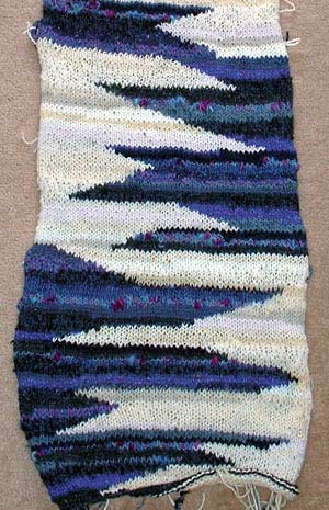 This scarf is about 7.5 inches wide and as long as you want (6 feet is a good size). The width is based on an approximate average gauge of 4 sts per inch on size 10.5 (US) needles. I used approximately 30 different colors and fibers for this scarf. Select colors from two contrasting color groups (in this case, I used blue and white). The scarf is doubled and sewn together and that makes it very, very warm.You could make this scarf using only two yarns as well, one for each contrasting color. Two variegated yarns would be very interesting.There are not exact row by row instructions for this scarf. Follow the general outline as written or the chart below but feel free to experiment as you go; this is free form knitting!