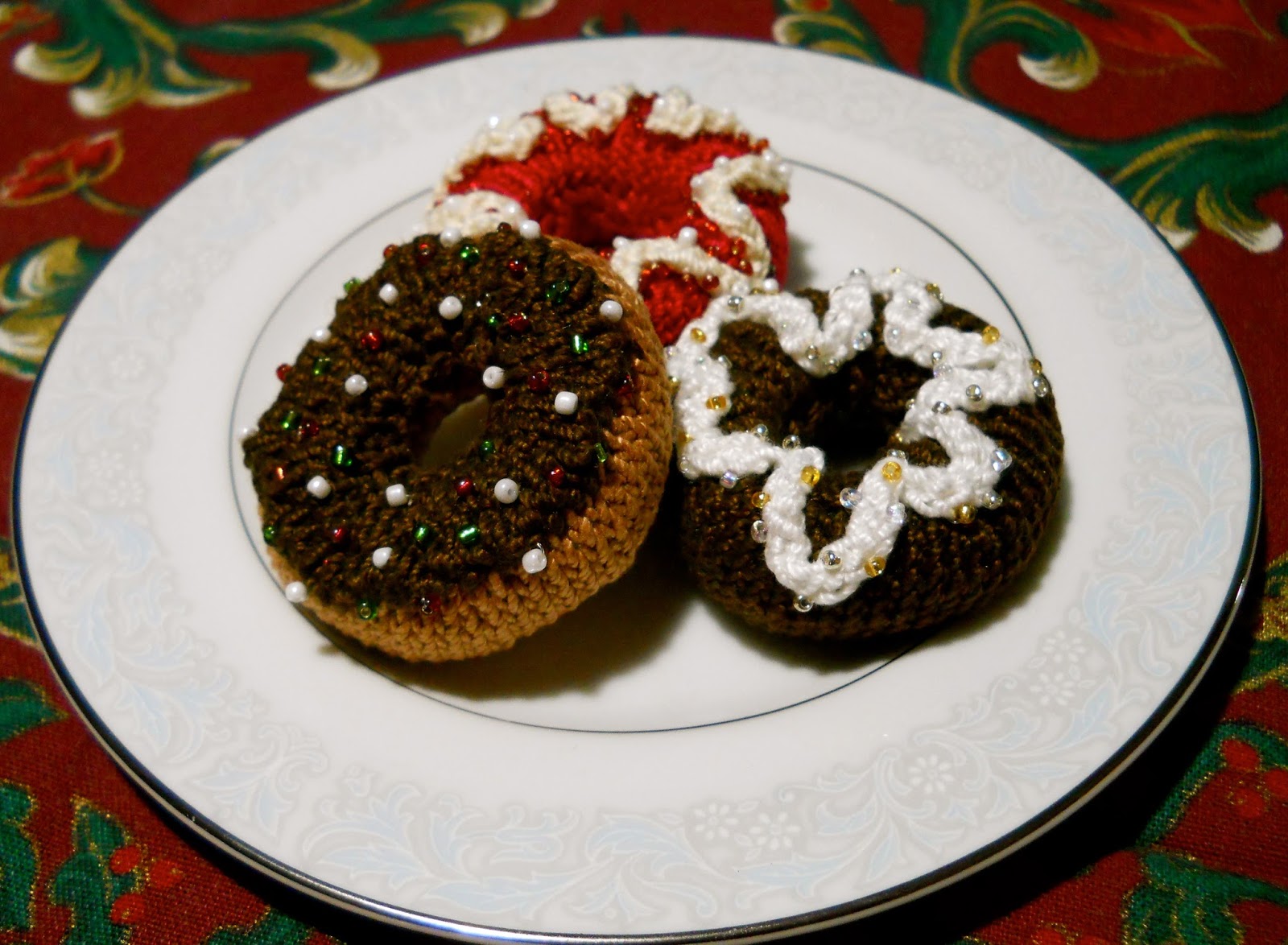 As for additional supplies, you'll need a small amount of batting to stuff the donut; beads, a beading needle and beading cord if you want to add sprinkles; a needle for assembly; and ribbon or cord from which to suspend the donut--if you want to make an ornament. It also helps to have a crochet hook, chopstick, or similar tool to assist with the stuffing process.