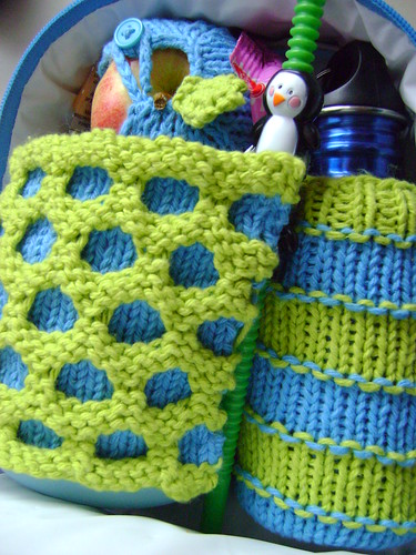 Cut yarn, leaving 12" or so of length. Thread this length on a yarn needle and take each stitch off the dpns, pulling tight to close the bottom of the cozy. Weave in ends.