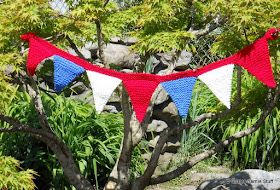 - The bunting in the photo is Cherry, Blue and Soft White Red Heart Super Saver.