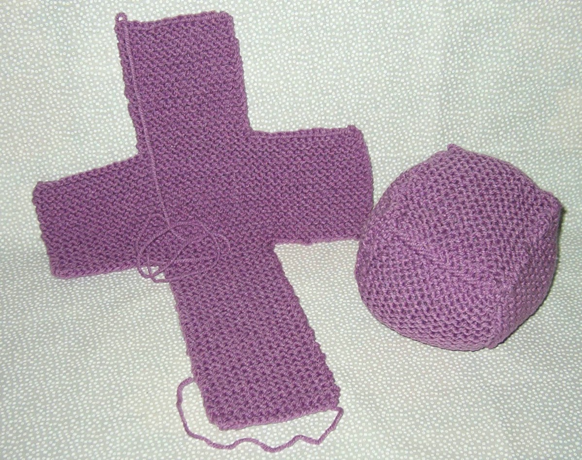 Note: What you are making is a knitted cube. When it is knitted, it will look like a cross. When it is folded, sewn, and finished, it will look like a box with a lid, until you put the stuffing inside and sew the last seams closed.
