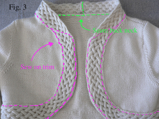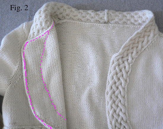 Make a third band that is long enough to wrap around the neckline, front and lower edges of the sweater, with the ends of the band meeting at the back neck. The band should overlap the front edges of the sweater, giving the lapels a rounded shape (see Fig. 2).