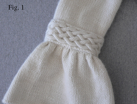 Using US 6/4mm needles and CC, CO 29 sts. Work two bands of Braided Cable that are each long enough to fit around a sleeve, just above the row of pleats (see Fig. 1). The sleeve bands should be snug, but not tight enough to pucker the upper part of the sleeve.
