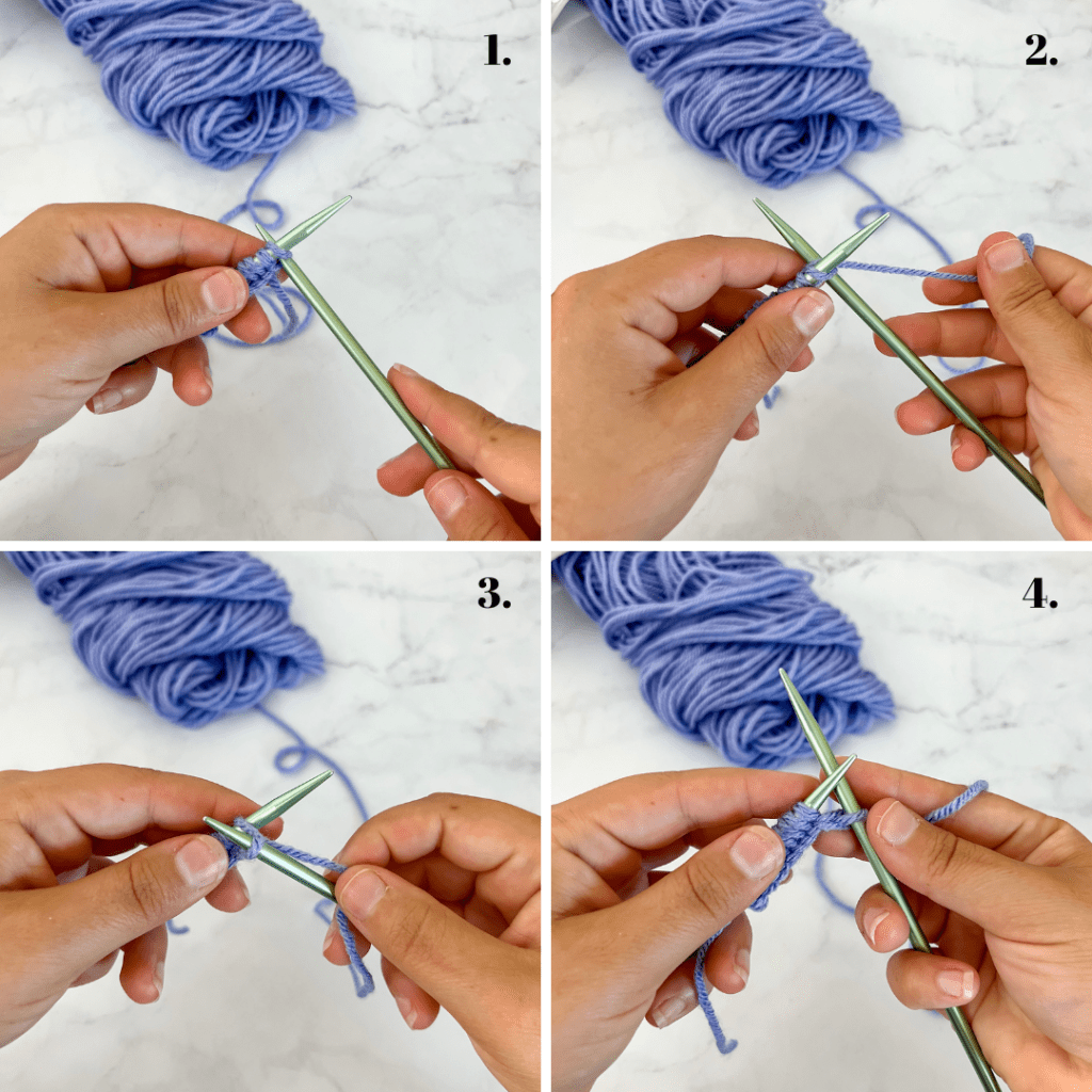 Place the needle with the stitches on it, in your left hand and the empty needle in your right hand. Make sure the working yarn is in the back.