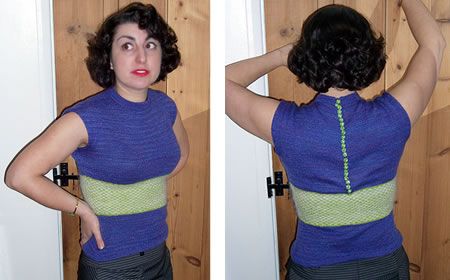 As with many of these 50s patterns, only one size is given: 33-34 inch bust. The sweater is designed to fit snugly, but probably will not fit most of us.