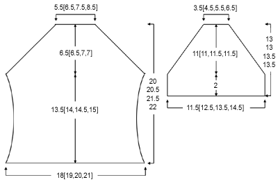 Note: While the directions call for knitting in the round up to the sleeves, you can work it in two pieces if desired. Increase the number of cast-on stitches by 4, and divide by two to give you the appropriate number to cast on for the front and back. Make increases and decreases at the ends of rows instead of near the markers.