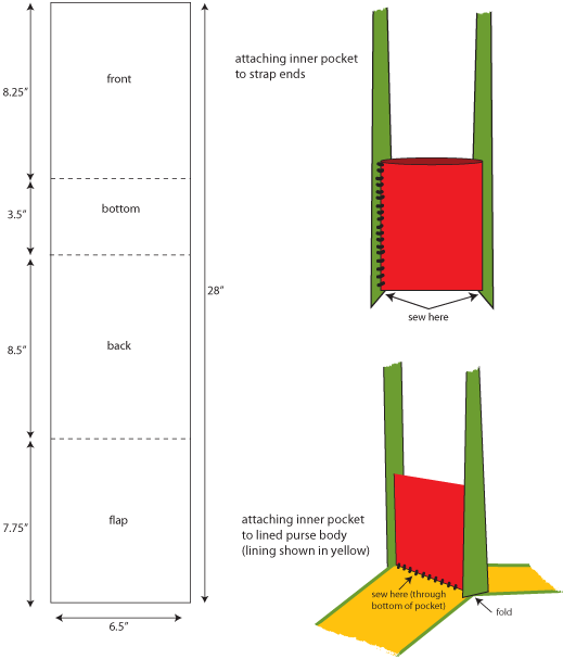 Attach bottom of inner pocket to inside of purse (see diagram below):