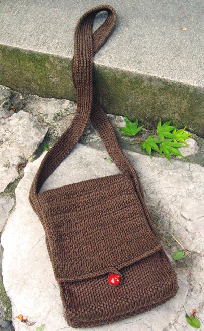 Pin edges of strap to edges of purse body. Sew across bottom of strap and up one side, catching the inside edge of the i-cord edge stitch. When you reach the top of the purse, break the yarn and stitch the other side together, starting from the bottom up.